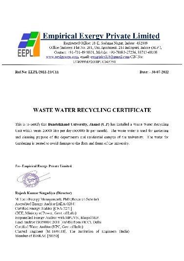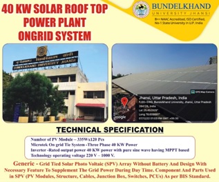 Bundelkhand University has taken measures for energy conservation by installing sixty solar smart light (40 W) in the campus.